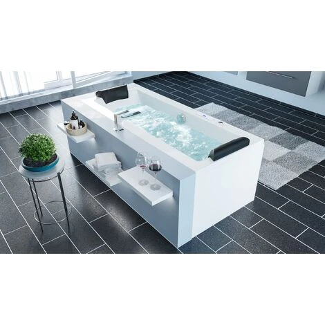 Bañera hidromasaje Deus Universal Premium Sin grifos (L/A/A) 182/80/66 cm Apropiado para hasta 2 persona/s!dimensions Dimensión: (L/A/A) 182 / 80 / 66 cm. Poder de masaje de la bañera hidromasaje (EQUIPO ESTÁNDAR): 4 piezas. Hidro-jets laterales grandes, 2×4 piezas. Hidro-jets grandes en la parte posterior (cuatro piezas. Jets para la región cervical), 8 piezas. Aero jets en el fondo (efecto burbuja). Material: tina hecha de acrílico sanitario apoyado en un marco sólido de metal con pies ajustables. Peso: 88 kg (sin el embalaje), 98 kg (con embalaje). Capacidad aprox. 250 de litros de agua (sin persona) hasta el rebosadero. Ventajas de la bañera hidromasaje de Emotion (Hecha en Alemania): Terapia de luz LED integrada. Panel de control fácil de usar. Caja de control electrónico y panel de control aprobados por normas CE. Temperatura regulable. Mangueras de PVC especiales para hidromasajes. Sensor de nivel de agua con dry run