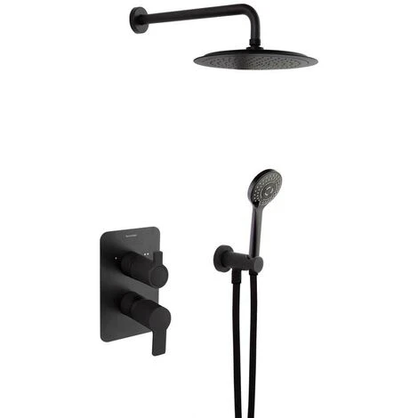 Conjunto de ducha empotrado 2 vías de la colección de baño BLAUTHERM. Está compuesto por grifo monomando empotrado 2 vías con soporte, toma de agua, rociador ABS Ø240mm, teleducha massage 3 posiciones ABS anti-cal Ø100mm y flexo color metálico alto brillo 1,75m antigiratorio Soleflex. Sistema S2 ahorro de agua del 50%, cooltouch, limitador temperatura. Descubre la colección de grifería negra.