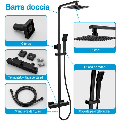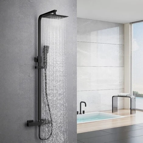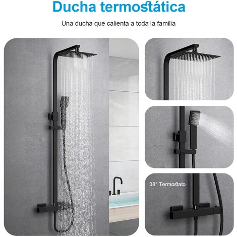 Sistema de ducha Heilmetz negro con termostato conjunto de ducha de lluvia, columna de ducha de acero inoxidable 304 con ducha superior y teleducha.