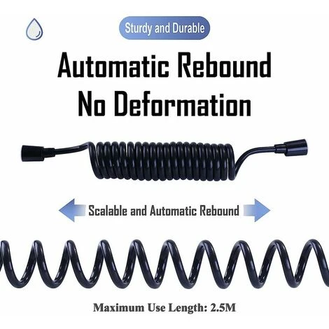 DISE?O EN ESPIRAL: La manguera de resorte tiene buena elasticidad. Se puede estirar libremente entre 43 cm y 2,3 m. La longitud máxima de trabajo es de 2,5 m. Resuelve los problemas de roce del flexo de la ducha con el suelo y ensuciamiento, dejando el ba?o y el aseo más limpios.