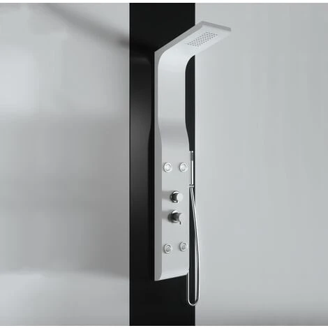 Panel de ducha de ABS pintado en polvo blanco mate con cabezal de ducha y chorros de hidromasaje. Este producto es la solución ideal para los amantes de la ducha relajante. Es un modelo con detalles minimalistas y con formas sinuosas que harán que el baño sea moderno y elegante. Este panel de ABS, ligero y resistente, tiene cuatro chorros de hidromasaje en ABS incrustado y una ducha de mano cromada en abs. El mezclador con tres funciones ofrece la posibilidad de controlar el chorro de agua deseado. El precio incluye la manguera, la ducha de mano y el mezclador con tres funciones que son: cabezal de ducha, ducha de mano, chorros de masaje. Se recomienda una altura de instalación de 80-110 cm, altura relacionada a las conexiones de frío y calor, que tienen una distancia de 8-17 cm.