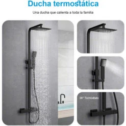 Columna De Ducha Termostático Negro Mate Redonda. Tubo Regulable En Altura De 83 A 120 Cm.