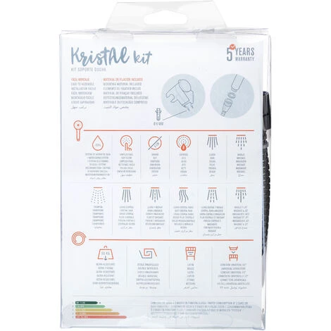 Kit ducha modelo Kristal, compuesto de ducha de 8 funciones, que se seleccionan girando la corona, diametro 8 cm, con sistema de ahorro de agua, caudal de 10L/min a 3 bars de presion. Soporte cromado multiposicion y flexo metal inox de 1,5 m.