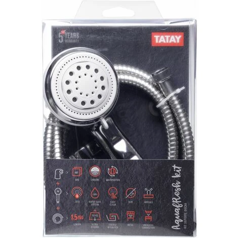 Kit de ducha cromado, modelo Aquafresh, compuesto de ducha de 4 funciones, diametro 8 cm, con sistema de ahorro de agua y sistema anti-cal, caudal de 10L/min., soporte regulable multiposicion y flexo metal de 1,5m . Incluye tornillos para su instalacion.