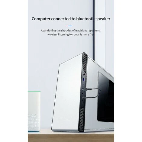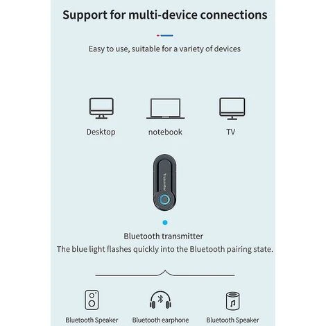 - Encendido/apagado automático: acceda al dispositivo a través de la interfaz USB, sin fuente de alimentación externa, encendido/apagado automático con el estado del dispositivo conectado. Plug and Play: no es necesario instalar software ni controladores adicionales, simplemente conecte el transmisor Bluetooth para una fácil conexión. Ampliamente compatible: permita que los televisores, computadoras, automóviles y otros dispositivos agreguen capacidades de Bluetooth, lo que les permite conectarse con altavoces, auriculares y otros dispositivos de reproducción de audio Bluetooth. Baja latencia y alta calidad: la capacidad estable de transmisión de señal de Bluetooth permite que el dispositivo mantenga una alta definición dentro de una distancia efectiva de 10 metros sin congelarse. El códec de audio aptX puede lograr un estéreo de alta fidelidad y brindar una mejor experiencia. Inalámbrico, disfrute de la paz de una persona: puede disfrutar de los beneficios del audio Bluetooth mientras hace ejercicio, ve programas de televisión nocturnos o simplemente cuando quiere entretenerse solo.Versión de Bluetooth: V4.2 Rango de transmisión: 10M Horas de trabajo: alimentado por USB Material de la carcasa: ABS Función del producto: Transmisor de audio Bluetooth estéreo Peso del metal desnudo: 11,88 gramos Peso del paquete: 65 gramos Tamaño del producto: 65 x 26 x 11 mm El paquete incluye: 1 transmisor Bluetooth 1 cable de audio 3,5 1 cable AV 3,5 para TV