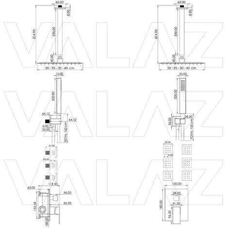 Materiales: Rociador de acero inoxidable, monomando de latón, alcachofa de mano de PVC ,flexo de acero inoxidable y 6 jets empotrados.
