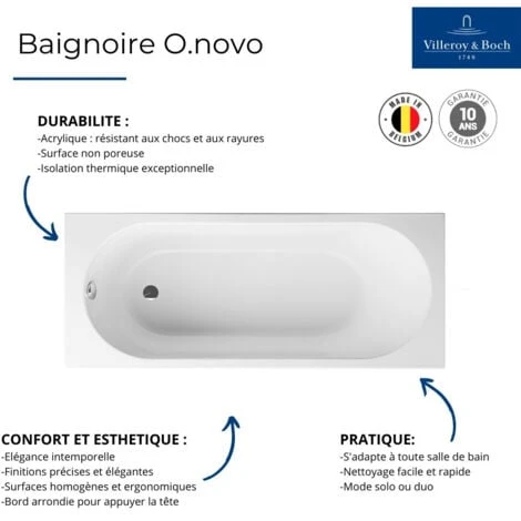 Encanto atemporalBañera individual con desagüe en el lateralAcrílico resistente y agradable al tactoO.novo – Sorprendentemente diferenteLa sobria bañera O.novo combina perfectamente con los revestimientos antideslizantes y otros detalles de Villeroy & Boch.Gran comodidad de la mano de expertosLimpieza rápida y sencillaResistente a golpes e impactosDisponible como variante individual y dobleBañera individualLas bañeras individuales se caracterizan por su desagüe lateral. En combinación con los muebles de baño elegantes de Villeroy & Boch, invitan a disfrutar del momento sumergido en agua caliente mientras deja vagar su mente.Ideal para espacios pequeños o apartamentosDesagües de fácil acceso para facilitar la instalaciónRelajación mediante un diseño exclusivo45 años de experiencia en acrílicoEl nombre de Villeroy & Boch es sinónimo de máxima calidad desde 1748. Y nuestros productos sanitarios acrílicos no son ninguna excepción. Mobiliario de baño de calidad, resistente y atractivo: esto es Villeroy & Boch.Antideslizante y, a pesar de ello, lisoSuperficies acrílicas fáciles de limpiar de Villeroy & BochMaterial de colores sólidos para disfrutarlos durante mucho tiempoEl material ofrece una gran resistencia contra el impacto de objetosSistemas de hidromasaje – Descubra su solución de wellnessFunción de hidromasaje: perfecta relajación mediante eyectores de masaje para bañeras de diferentes modelos de Villeroy & Boch.Elección entre eyectores de aire y de agua o una combinación de ambosDos variantes de confort: Entry y ComfortDos variantes de bañera de hidromasaje para gustos exclusivosPosibilidad de incorporar asiderosUn práctico asidero para bañeras de Villeroy & Boch garantiza una sujeción firme al entrar o salir de la bañera.Asidero de resistente latón cromadoLos asideros suponen una ayuda para los usuarios del cuarto de bañoAyuda para entrar y salir de la bañeraMayor seguridadSistema de desagüe y rebosadero Multiplex Trio con entrada de aguaMultiplex Trio de Villeroy & Boch integra las funciones de desagüe y rebosadero.Envío del juego completoEntrada de agua a través del cuerpo de desagüeCon cierre antiolores integradoProfibox 2.0 – Revestimiento para bañeras rectangularesLos revestimientos para bañera Profibox 2.0 de Villeroy & Boch permiten personalizar la instalación de la bañera.Se entrega premontado para todos los modelosPosibilidad de instalación encastrada y en esquinaDisponible en blanco Alpin