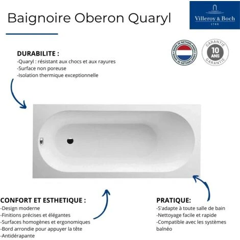 Se adapta a numerosos estilosBañera individual con desagüe en el lateralDe Quaryl®, extremadamente resistente a golpes, impactos y arañazosOberon – Claridad de diseño y funciónFormas exteriores claras y líneas suavemente onduladas hacen de las bañeras de Quaryl® de Oberon la base perfecta para combinar con sistemas de hidromasaje.Rectángulo y óvalo en unoRebosadero disponible en tres posicionesRebosadero disponible en tres posicionesPrecisión milimétrica que convence.Bañera individualLas bañeras individuales se caracterizan por su desagüe lateral. En combinación con los muebles de baño elegantes de Villeroy & Boch, invitan a disfrutar del momento sumergido en agua caliente mientras deja vagar su mente.Ideal para espacios pequeños o apartamentosDesagües de fácil acceso para facilitar la instalaciónRelajación mediante un diseño exclusivoQuaryl® – Naturaleza perfeccionada.En Quaryl®, Villeroy & Boch combina con maestría el resistente cuarzo y el moderno acrílico sanitario. El innovador material es antideslizante y fácilmente moldeable, lo que permite obtener diseños exclusivos.Efecto de insonorizaciónMaterial sin poros, fácil de limpiarSuperficie agradable y cálida, con aislamiento térmicoCertificado TÜV, superficie antideslizanteSistemas de hidromasaje – Descubra su solución de wellnessFunción de hidromasaje: perfecta relajación mediante eyectores de masaje para bañeras de diferentes modelos de Villeroy & Boch.Elección entre eyectores de aire y de agua o una combinación de ambosDos variantes de confort: Entry y ComfortDos variantes de bañera de hidromasaje para gustos exclusivosPosibilidad de incorporar asiderosUn práctico asidero para bañeras de Villeroy & Boch garantiza una sujeción firme al entrar o salir de la bañera.Asidero de resistente latón cromadoLos asideros suponen una ayuda para los usuarios del cuarto de bañoAyuda para entrar y salir de la bañeraMayor seguridadSistema de desagüe y rebosadero Multiplex Trio con entrada de aguaMultiplex Trio de Villeroy & Boch integra las funciones de desagüe y rebosadero.Envío del juego completoEntrada de agua a través del cuerpo de desagüeCon cierre antiolores integradoProfibox 2.0 – Revestimiento para bañeras rectangularesLos revestimientos para bañera Profibox 2.0 de Villeroy & Boch permiten personalizar la instalación de la bañera.Se entrega premontado para todos los modelosPosibilidad de instalación encastrada y en esquinaDisponible en blanco Alpin